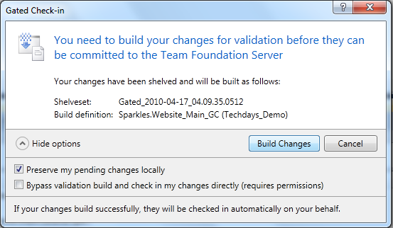 What meant to be a small post on the Gated Check-in feature in Team Foundation Server 2010 ended up in a more detailed explanation of how it works and how you can work with it in the Visual Studio IDE. Remember that you should setup the most appropriate build types according to your specific branches. Not all branches may need a Gated Check-in build. Only configure this for branches that should never have a broken build. A Gated Check-in build may for example validate a big merge operation from a development branch to a stable main branch.