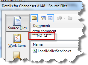 A last thing to note is that the comment that was originally supplied to the changeset by the developer will be suffixed with the NoCICheckinComment variable (default = ***NO_CI***) to prevent that another continuous integration build will be fired after the final check-in done by the Gated Check-in build.