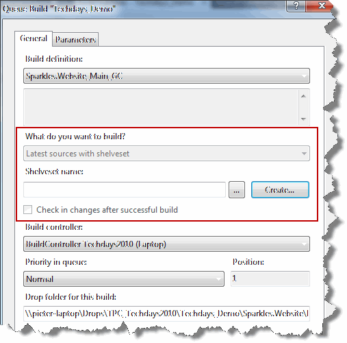 The Gated Check-in build may also be kicked off manually where you may need to create a shelveset or where you may point to an existing shelveset.