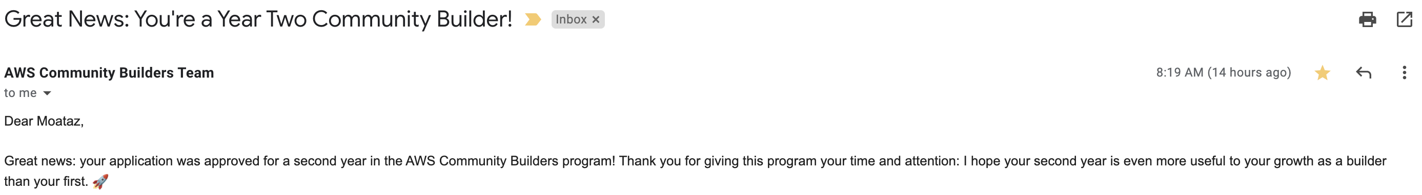 I just confirmed to be for the second year in the AWS Community Builders program in the Web and Mobile Category. Really enjoyed the first year and will continue contributing to the community in the second one.